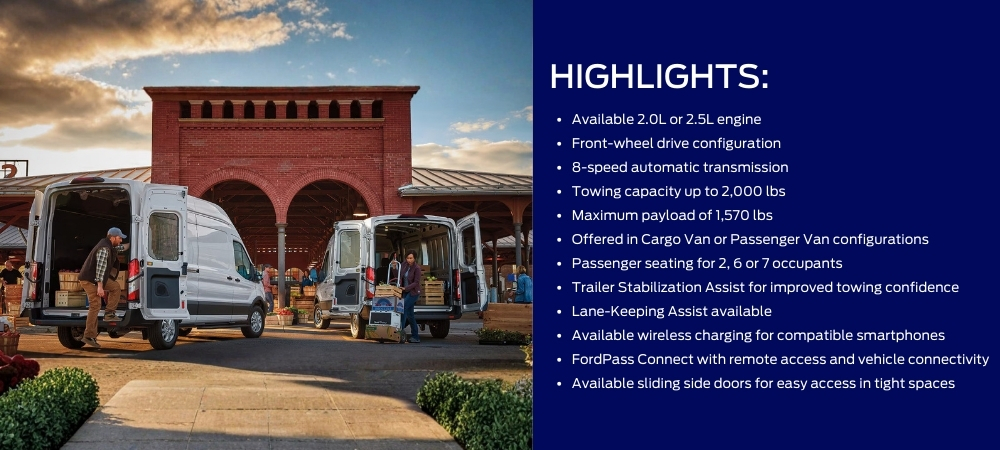 Whether you are running a business, managing group transportation or supporting an active family lifestyle, the Ford Transit Passenger Van delivers the space, flexibility and confidence you need to get the job done.