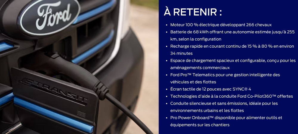 Le Ford E-Transit 2026 est conçu pour les entreprises qui recherchent une capacité entièrement électrique combinée à des outils connectés axés sur la productivité des flottes. Il associe une motorisation 100 % électrique à des configurations prêtes pour le travail, des technologies intelligentes et les solutions Ford Pro conçues pour maximiser la disponibilité de vos véhicules.