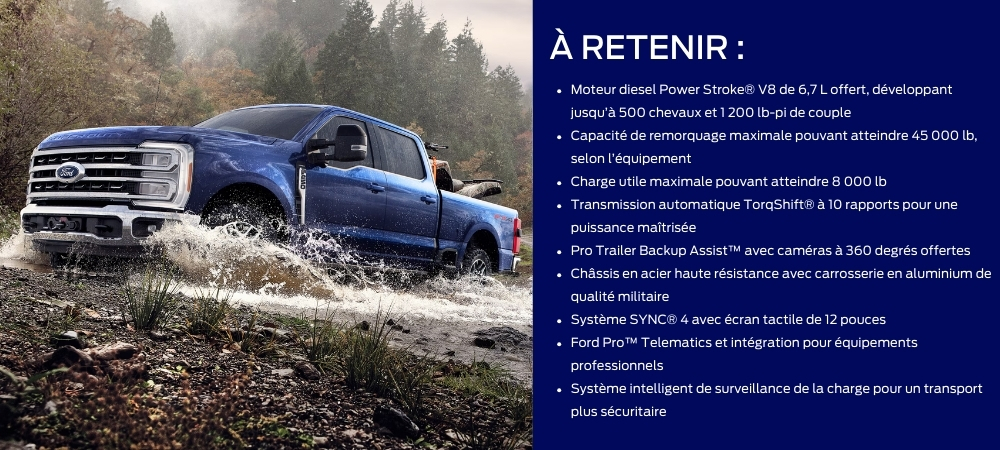 Le Ford Super Duty 2026 combine une robustesse sans compromis, des capacités de niveau commercial et des technologies avancées pour exceller dans les environnements les plus exigeants. Que ce soit pour transporter de l'équipement lourd, remorquer de grandes charges ou gérer une flotte, il offre la performance, la durabilité et le confort sur lesquels les professionnels peuvent compter chaque jour.